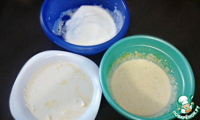 В кастрюлю положить сливочное масло. На самом маленьком огне растопить его. Масло должно быть чуть теплее комнатной температуры-около 30-35 градусов. Отделить белки от желтков.2 белка убрать в холодильник-они понадобятся нам для глазури. Взбиваем желтки с сахаром и ванилином, белки отдельно взбиваем с солью в крепкую пену.