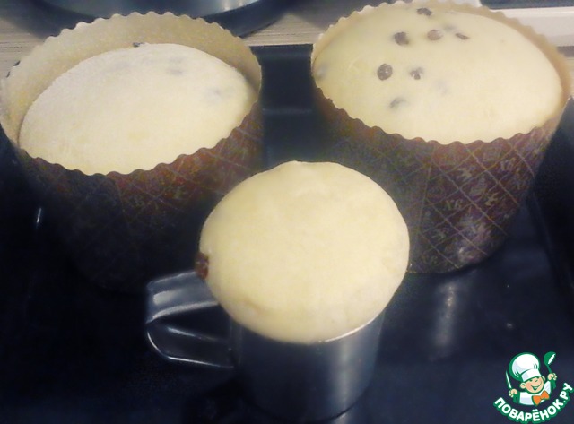 Добавляем изюм. Хорошо перемешиваем. Затем можно наполнять формы. Если формы бумажные, маслом их смазывать не нужно. Формы наполнить тестом (удобно насыпать половником или ложкой) на 1/3-1/2 высоты формы. Поставить в теплое место на 30-40 минут.