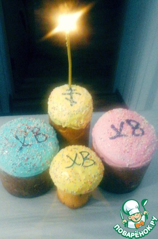 Горячими смазать куличи белковой глазурью. (Для глазури взбить охлажденные белки с сахарной пудрой, можно добавить 1-2 ч. л. лимонного сока и немного цедры.) Украсить куличи сахарной разноцветной посыпкой, кокосовой стружкой.