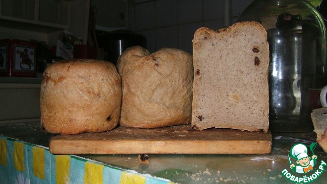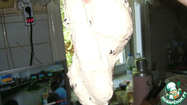 Оставшиеся 650 г теста размешиваем в 400 мл теплой кипяченой воды и добавляем 650 г просеянной пшеничной муки в/с. Вымешиваем 10 мин, потом продолжаем вымешивать, добавляя постепенно изюм и корицу, еще 10 минут. В конце добавляем растительное масло без запаха и вымешиваем до его впитывания в тесто.
