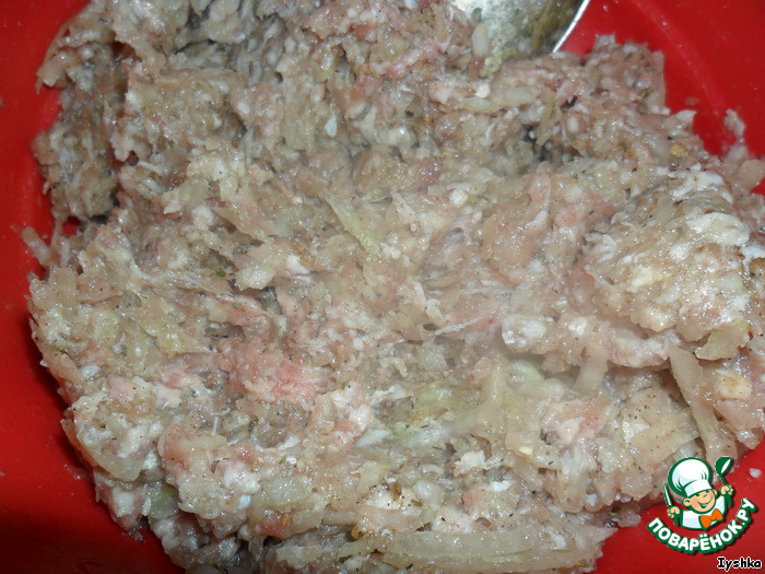 Готовим начинку. В фарш (у меня домашний) добавляем мелко нарезанный лук, соль, перец, специи по вкусу.