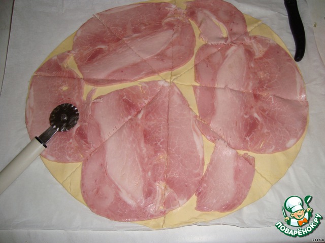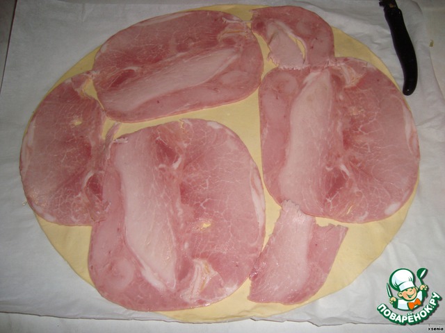 Раскатаем тесто в пласт толщиной не более 5 мм .Выкладываем на тесто ветчину