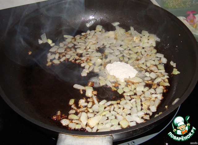 Лук мелко порежем ,обжарим до золотистого цвета на растительном масле и добавим муку