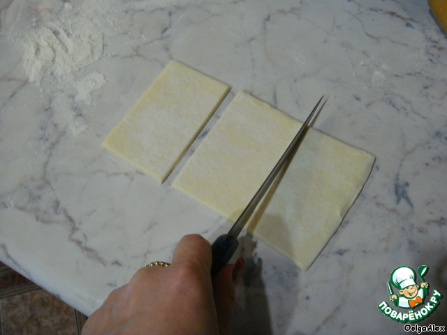 Пласт слоёного теста (у меня в пачке их 5 штуки), разрезаем на 3 части.
