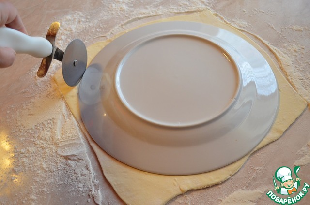 Тесто раскатать, но не сильно. Вырезать круг при помощи большой тарелки и ножа для пиццы.