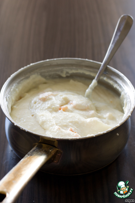 Утром, с новыми силами, сварить густую манную кашу - всыпать в холодное молоко с солью манку, довести до кипения, помешивая и варить 3-5 минут. Остудить. Всыпать сахар (лучше сахарную пудру - быстрее растворится), добавить рикотту, цукаты, корицу, ванилин и хорошенько вымешать. В Италии вымешивают руками. Я пас, воспользовалась миксером.
