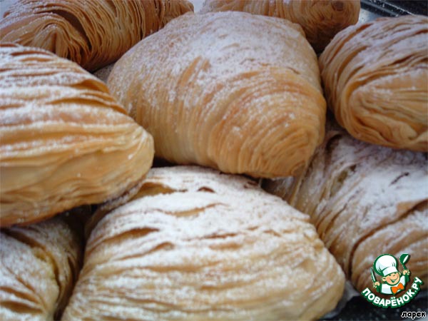 Теперь из каждого кружка надо сформировать конус. Взять в руки кружок, поставить большой палец в центр и начать вращать его между пальцев, смещая слои, как бы стягивая их вниз, формируя конус. Делать это следует осторожно – слои не должны разойтись. Где-то с пятой слойки дело пошло живее, я поняла технологию. Растягивать-расплющи вать слои надо максимально тонко, чтобы конус получился достаточно вместительным. Сразу же наполнить начинкой и положить на противень. Смазать яйцом и выпекать 20 минут при 180 градусах. Готовую слойку после остывания припудрить сахарной пудрой