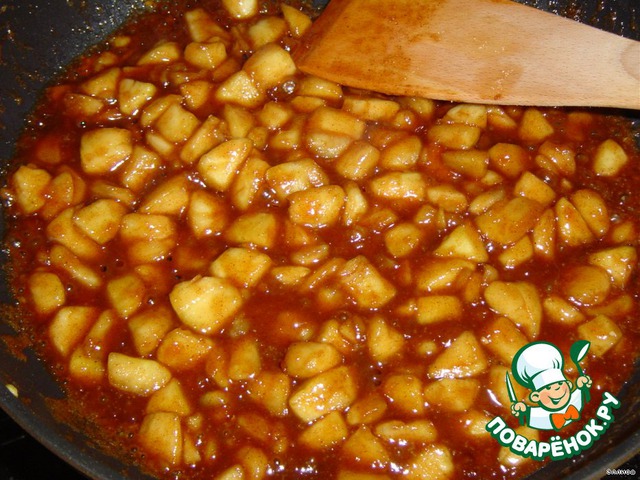 Теперь готовим яблоки в карамели. На разогретую сковороду выкладываем яблоки, масло, сахар, корицу и, постоянно перемешивая, готовим яблоки в течении 15 мин.