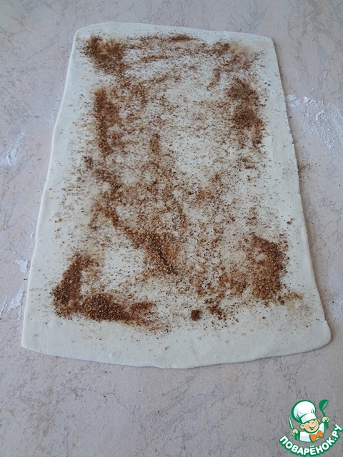 Тесто разморозить и раскатать в одном направлении. Посыпать молотой корицей (у меня с сахаром).