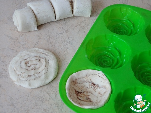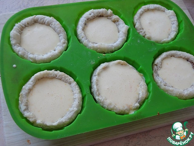 Придавить тесто в лепешечку, которую распределите в углубление в форме для кексов. Если нужно форму предварительно смажьте маслом. Немного наколите тесто вилкой и уберите заготовки в холодильник. Включите духовку.