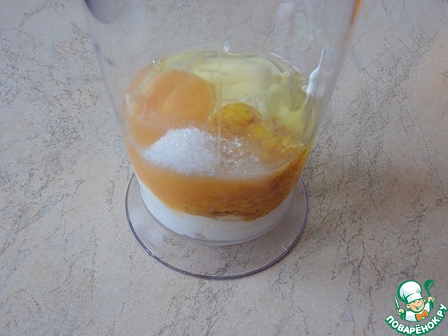 Сметану, яйцо, ваниль,1 ст. л. сахара и цедру апельсина тщательно перемешать.