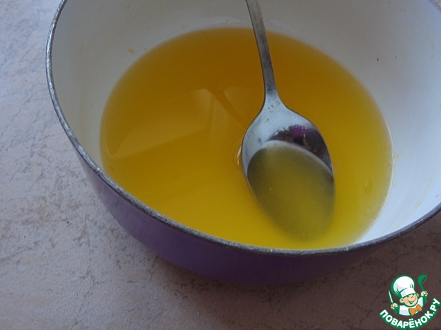 Тем часом в маленькой кастрюльке апельсиновый сок и 5 ст. л. сахара уварить до густоты и немного охладить.