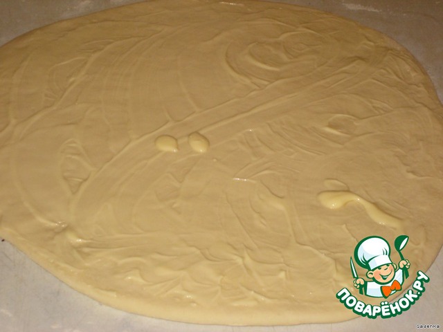Раскатать в круг, толщиной около 5-7 мм. Смазать сплошь размягченным сливочным маслом.