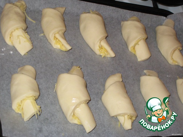 Скатать каждый треугольник в рогалик, от широкого края к узкому, чуть загнуть полукругом.