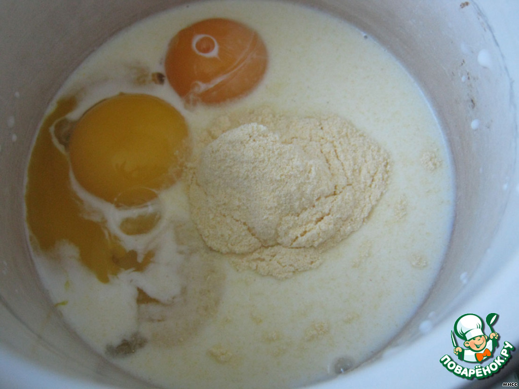 В другой ёмкости смешиваем венчиком желтки, 50 мл молока и кукурузную муку.