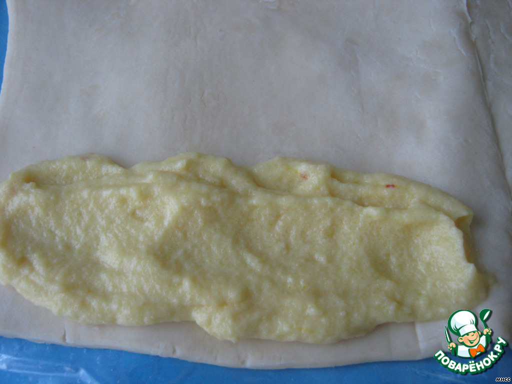 Оттаявшее тесто немного раскатайте вдоль. У меня тесто в виде рулона, так же поступайте с тестом в виде пластин.