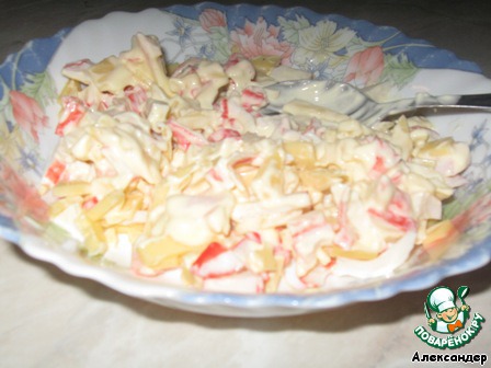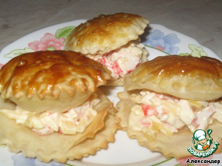 В это время делаем салат из крабовых палочек, сыра и майонеза. Начинка по-вашему усмотрению. Это может быть мясо, рыба, любой салат, в т.ч. "оливье". Или начинкой может быть сладкий творог, джем и заварной крем.