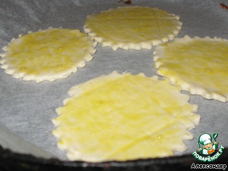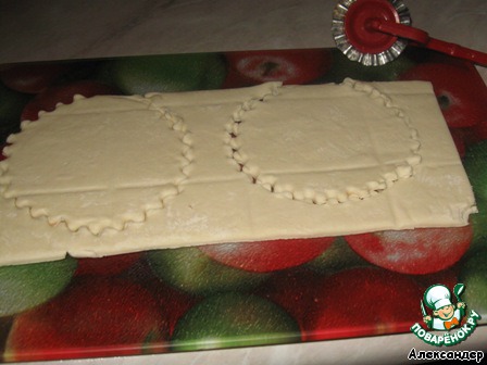 Берем лист слоеного теста (не раскатывать) и вырезаем кружки с волнистыми краями. У кого есть формочки для выпечки кексов, можно сделать ими.