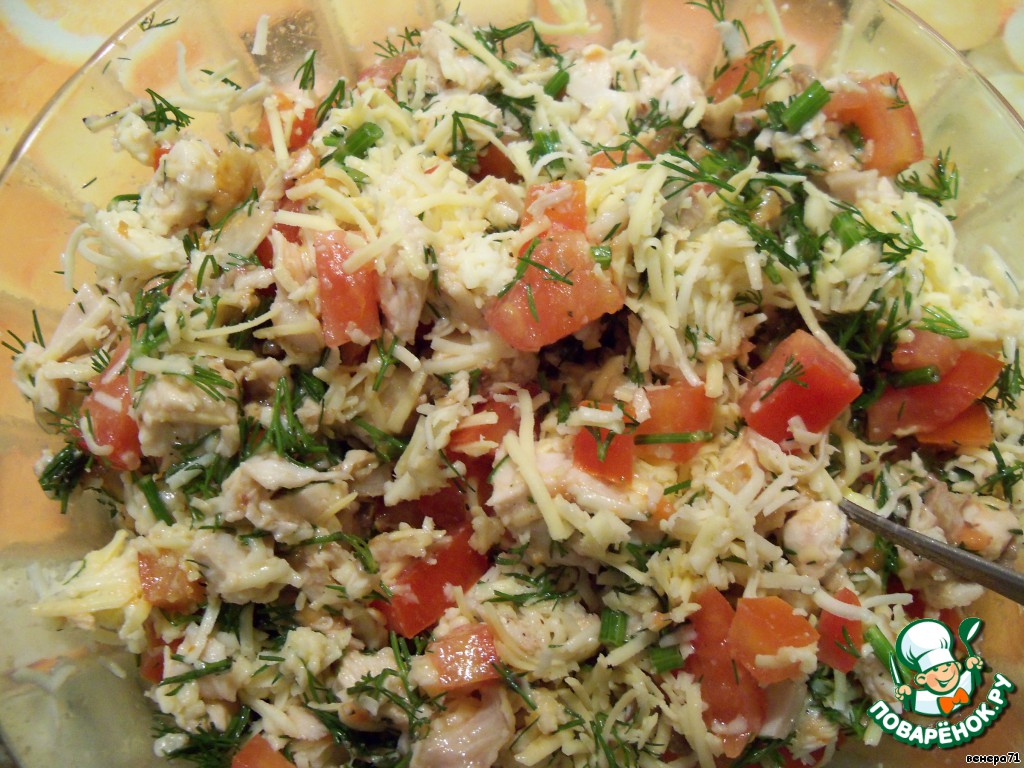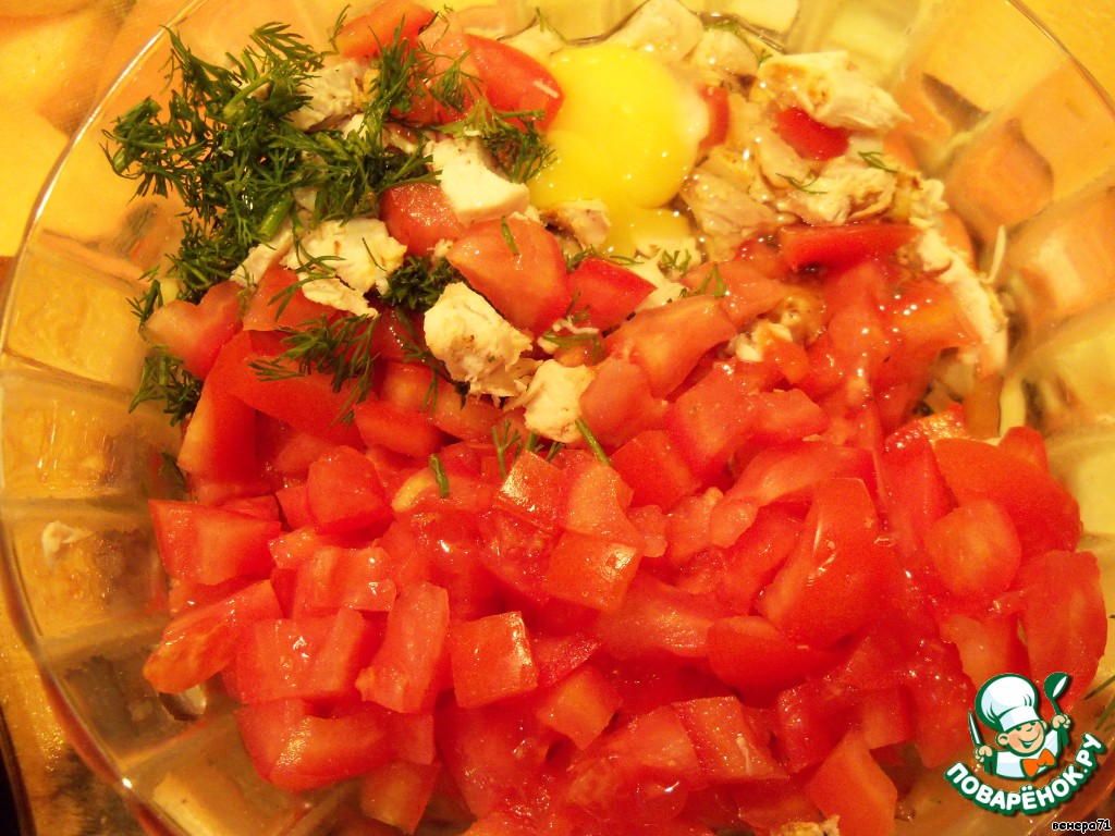 Мелко нарезать: куриную грудку, помидоры, укроп, чеснок,