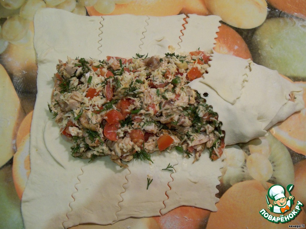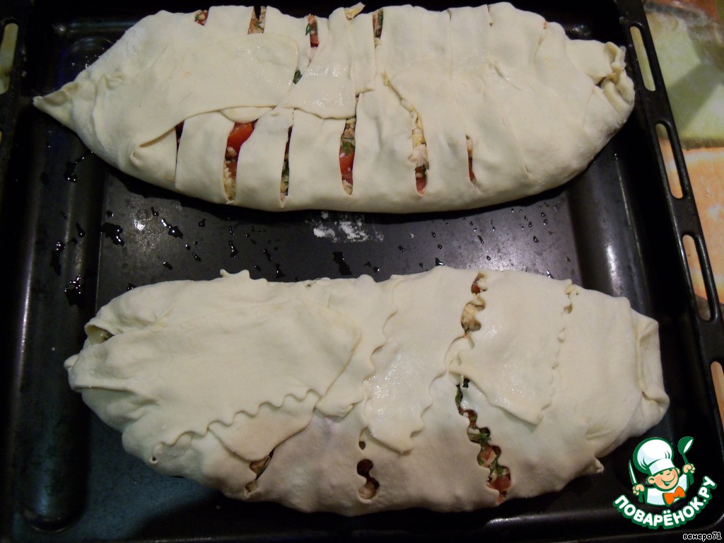 С каждой стороны сделать одинаковые надрезы и завернуть концы, смазывая водой (не знаю, как объяснить, смотрите на фото)