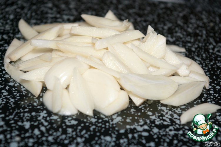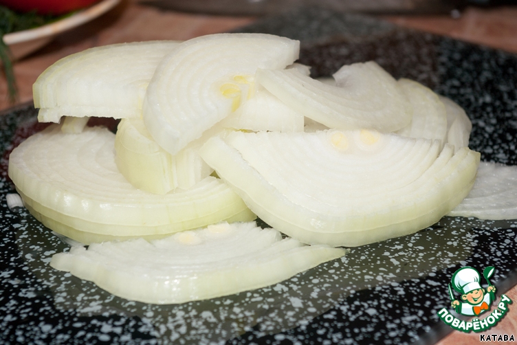 1 луковицу порезать кольцами и залить уксусом, отставить пока мариноваться.