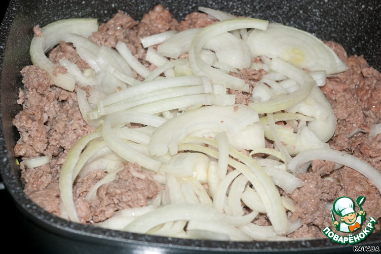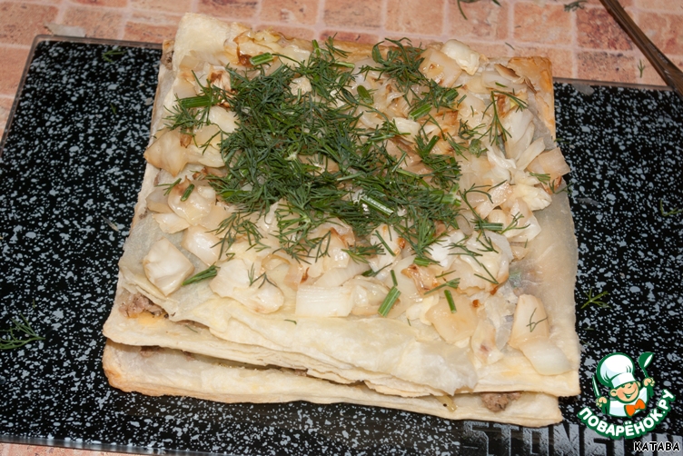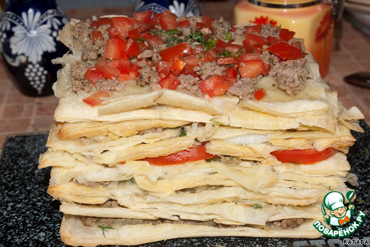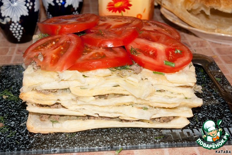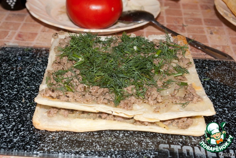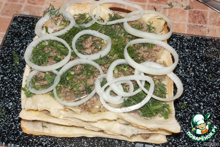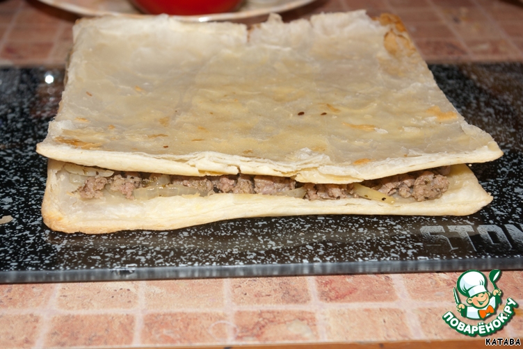 Самый лучший - это, конечно, домашный фарш. У меня тройной - говядина, свинина и немного баранины. Не жирный. Вы можете взять любой по желанию. Слоеное тесто используйте только магазинное. Выбирайте пластинами. У меня было 2 пачки по 2 пластины. Итого - 4. С них получилось 12 слоев. Если вам кажется много, то уберите 1 пласт.