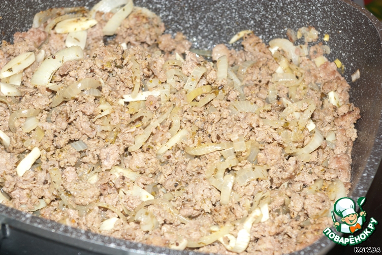 На сковороду наливаете немного оливкового (или растительного) масла, кладете фарш и потихоньку жарите, помешивая, чтобы не было слишком крупных комочков.