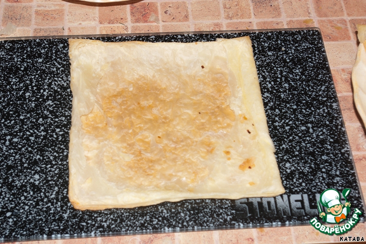 Итак, тесто. Выньте из упаковки замороженное и положите на противень, чтобы разморозилось. Ни в коем случае не раскатывайте его и не мните, чтобы не повредить слои и края. Мне пришлось запекать в 2 захода. Поставьте тесто в духовку на 30 минут при 180 градусах. Пока тесто печется, займемся начинками.