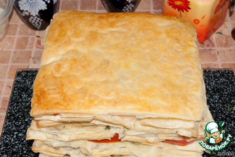 Теперь самое интересное. На низ берите слои поплотнее - донышко. Выше будут мягкие слои теста, а верх тоже будет донышком. Самый верхний слой запеченной слойки использовать не стала - слишком дутые вышли.