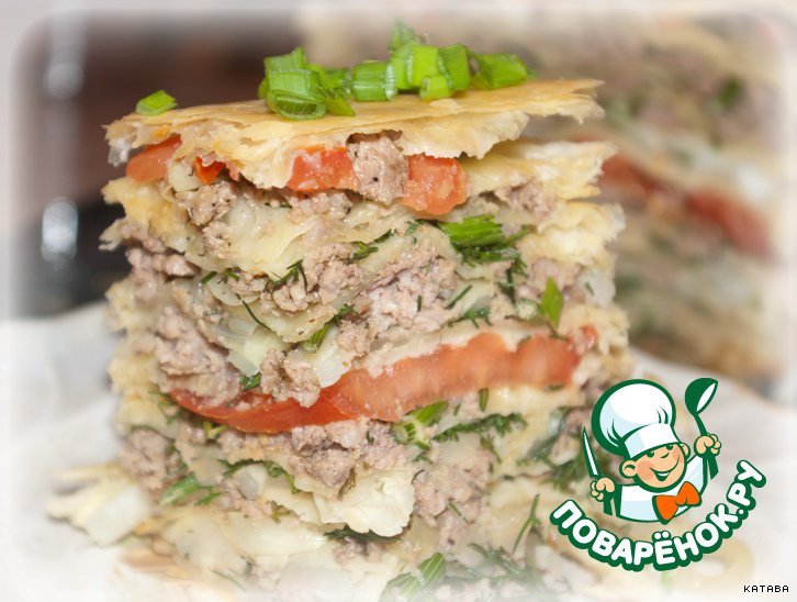 Затем вы чередуете слои с мясом и зеленью, где-то добавляете лук (каждые 2-3 слоя), слой капусты, слой мяса с зеленью, предпоследний слой я сделала с мясом, зеленью и помидорами.