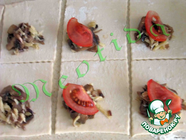 положить в уголок каждого квадратика сырно-грибную смесь, сверху кусочек помидора