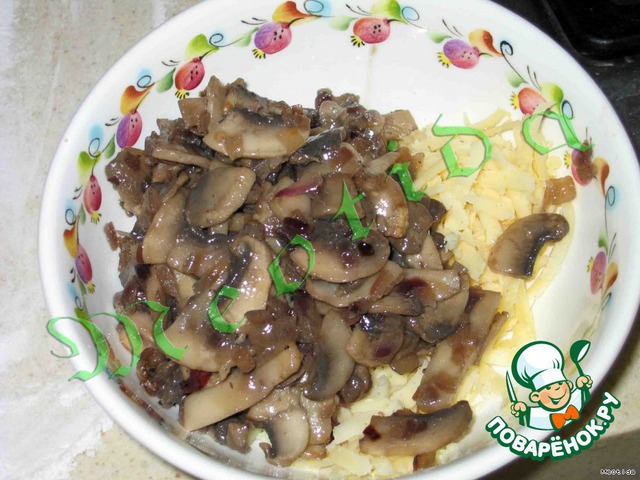 Грибы с луком обжарить на сковородке без крышки, пока вся вода не выпарится. Посолить и поперчить, сыр натереть на крупной терке