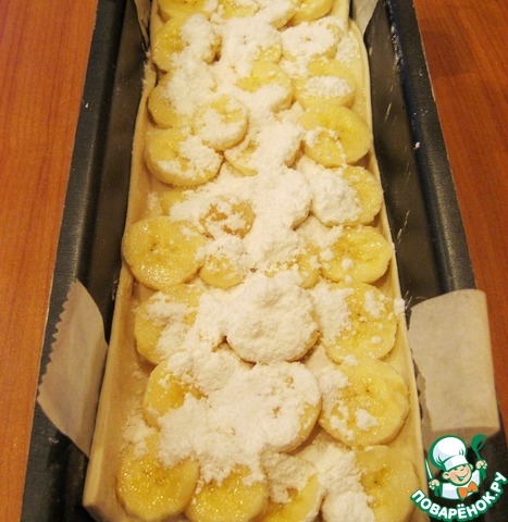Далее кладем опять слой теста и выкладываем нарезанный на кружочки банан. Сверху посыпаем 1ст. л. сахарной пудры.