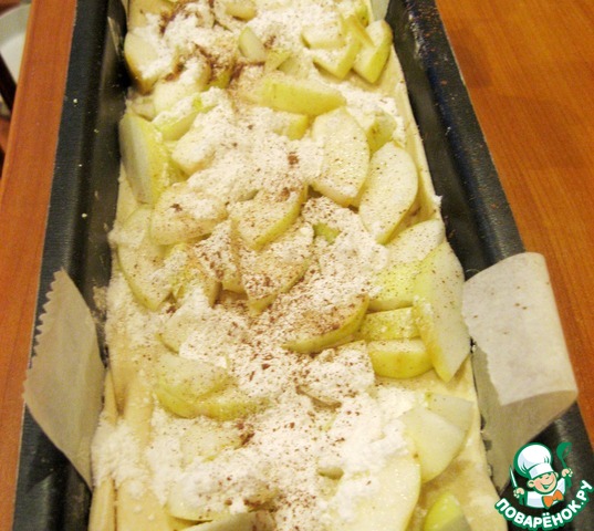 Затем последний слой теста и на него нарезанное дольками яблоко. Сверху посыпаем сахарной пудрой и корицей.