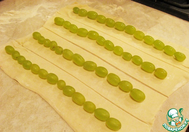 Оставшуюся 1/3 теста нарезаем на 4 полоски и выкладываем на них цепочки из винограда и защипываем.