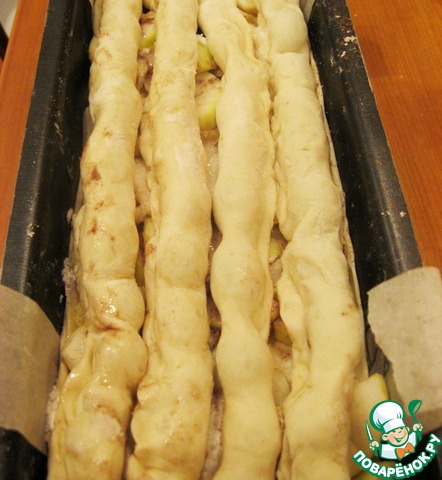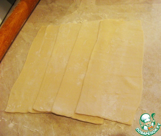 Раскатать тесто, отрезать от него 2/3 части и нарезать на 4 полоски по размерам формы. Форма должна быть глубиной 7 см и размером 30x10см.