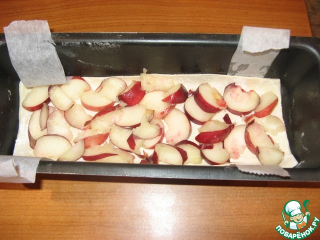 Смазать форму маслом и выложить первый слой теста, на него нарезанный дольками нектарин. Сверху посыпать 1ст. л. сахарной пудры.