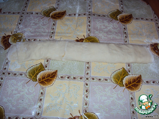 Тесто раскатать на столе в пласт толщиной 0,5 см. Смазать сырной начинкой, не доходя до краёв 2-3 см.