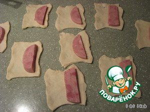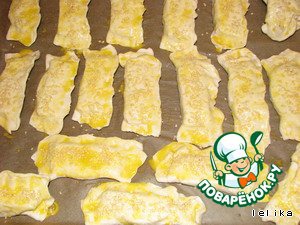 Тесто нарежем и растянем руками до нужного размера (мне кажется, так лучше, чем раскатывать скалкой).