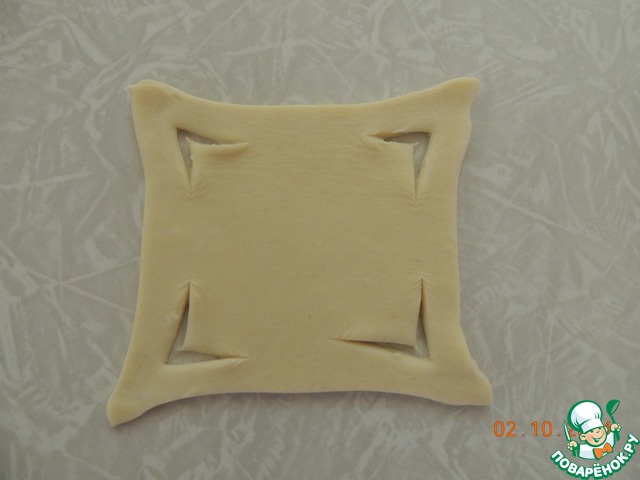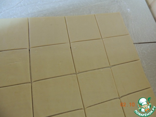 Тесто нарезать квадраты, я обычно покупаю тесто уже порезано квадратами...