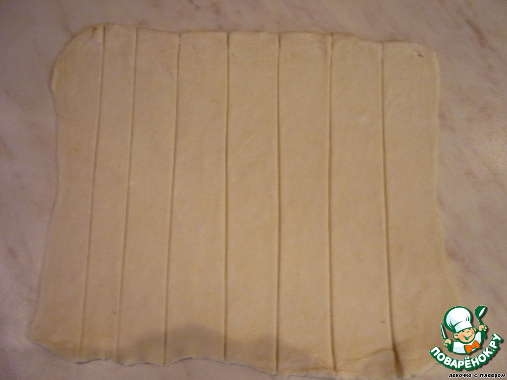 Слоеное тесто раскатать и нарезать полосками толщиной 2 см