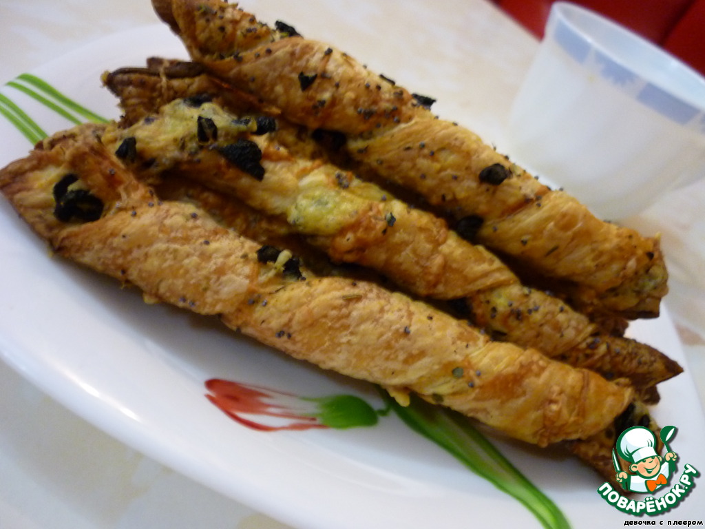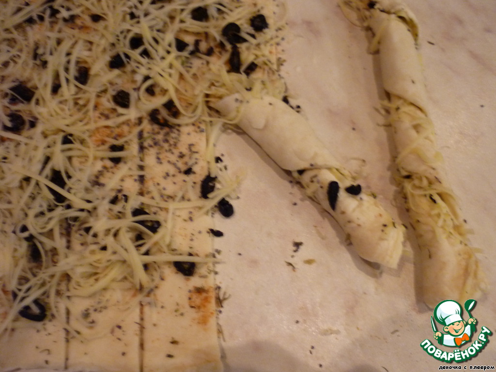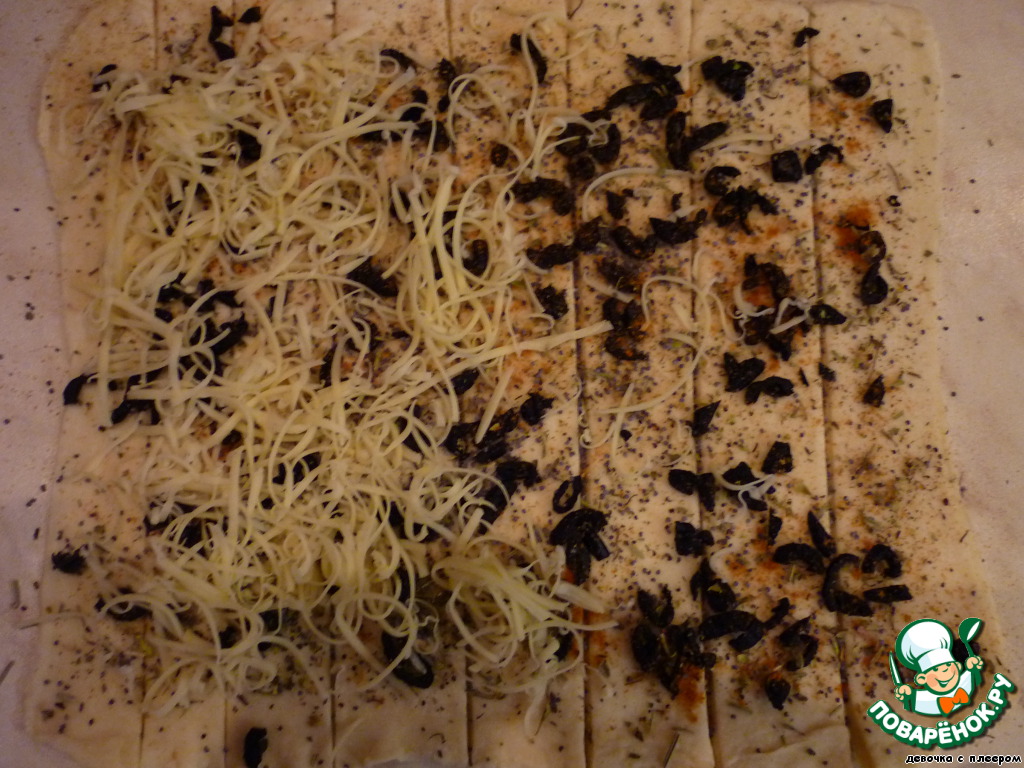 Маслины нарезать мелко. Посыпать слоеное тесто маслинами, солью, прованскими травами, красным перцем, маком и натертым на мелкой терке сыром.