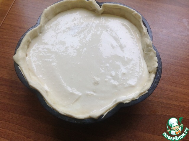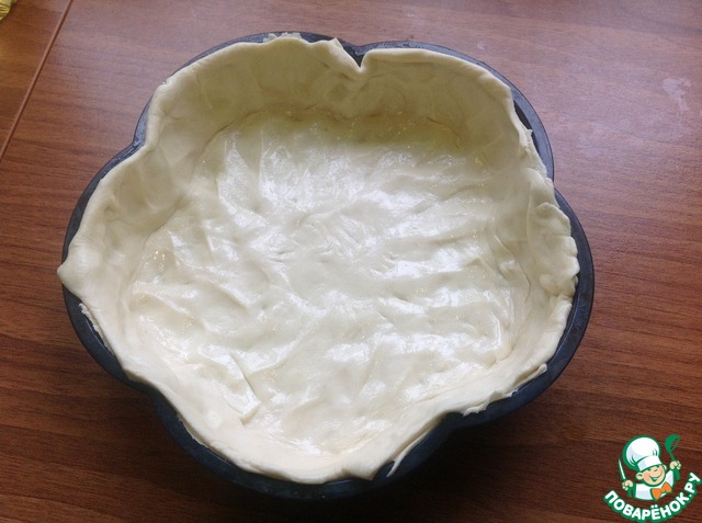Тесто, не раскатывая, руками выкладываем в форму, разравниваем, обязательно оставляем борта. Лишнее тесто срезаем ножом