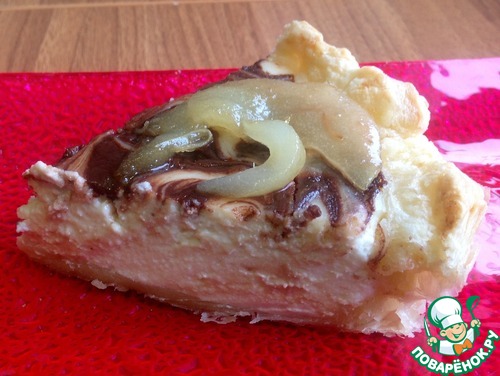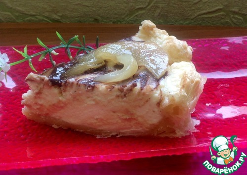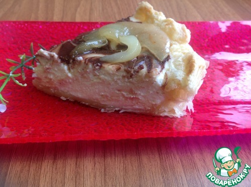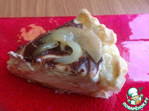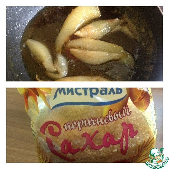 По желанию можно украсить пирог карамелизованной грушей. Для этого очистить грушу от кожи и семян, разрезать на 8 частей. В сковороду положить 20 г масла сливочного и 3 ст. л. сахара мистраль, дать раствориться сахару, выложить грушу и потушить ее.