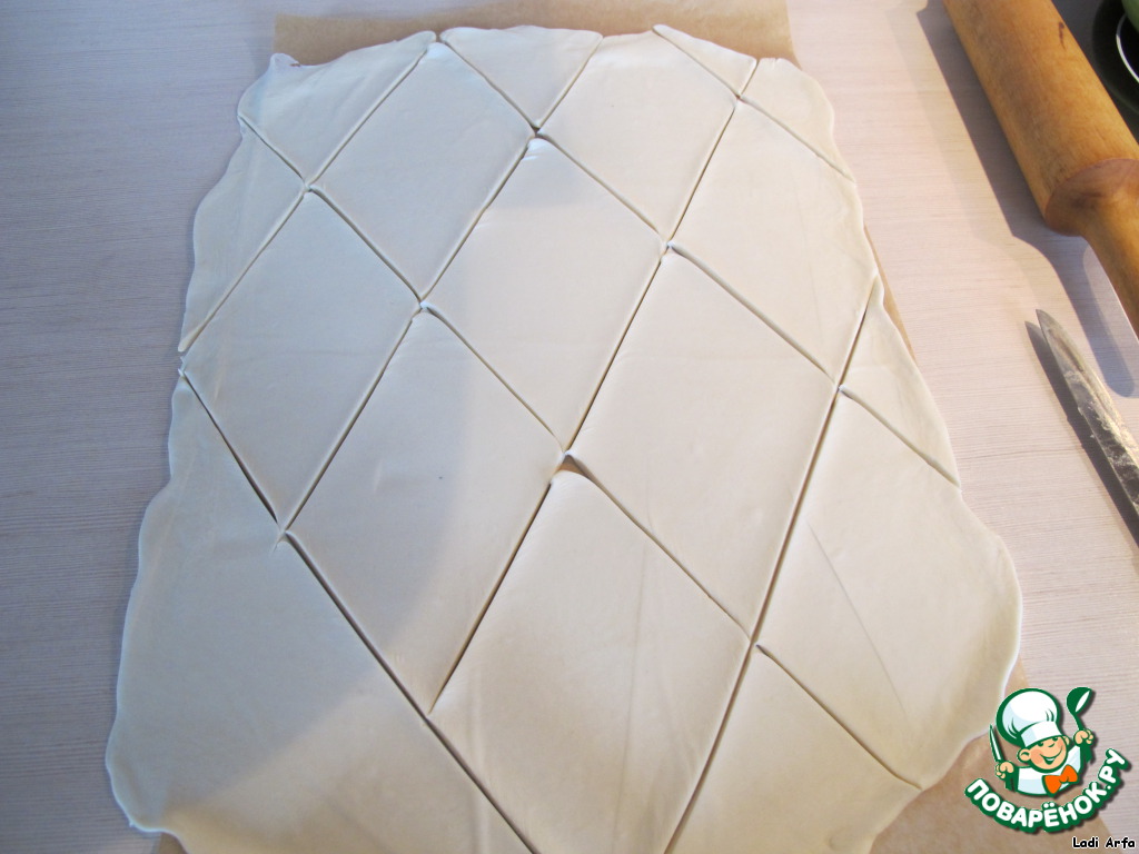 Купила 0,5 кг слоёного теста, раскатала на бумаге для выпечки (что очень удобно), нарезала ромбами.