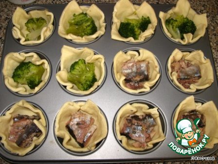 Я сделала половину с капустой, а вторую половину с рыбой, у меня была сайра. Косточки я вынула и разложила кусочки рыбки в формочки.