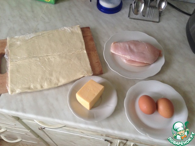 Для начала я подготовила все продукты. Филе и тесто разморозила. Все остальное достала из холодильника.
