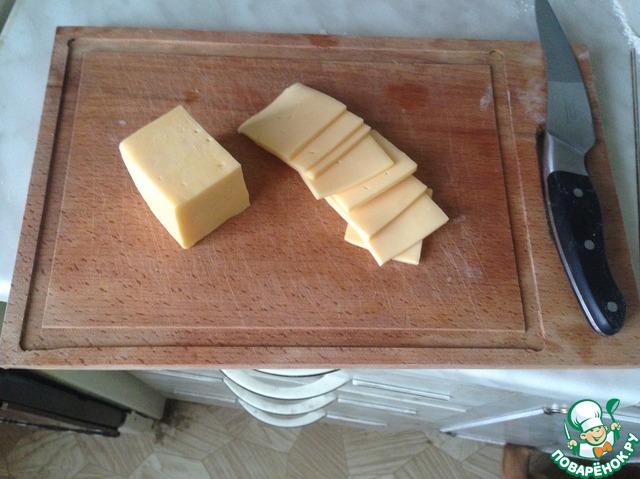 Сыр порезала тоненькими пластиками. Можно и на терке потереть.