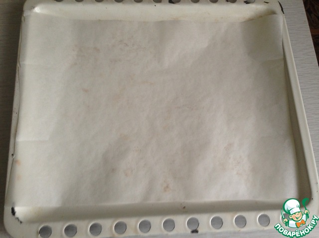 Включила разогреваться духовку. Противень застелила пергаментной бумагой. Я ничем не смазывала. Но если боитесь, что может пристать, то можно сбрызнуть водой. Маслом смазывать не обязательно.