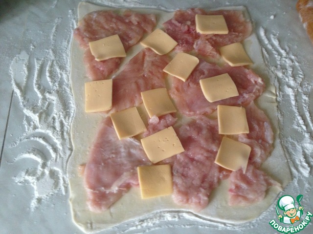 На тесто выложила отбивные и "пробелы" заложила сыром. Можно просто посыпать тертым сыром.